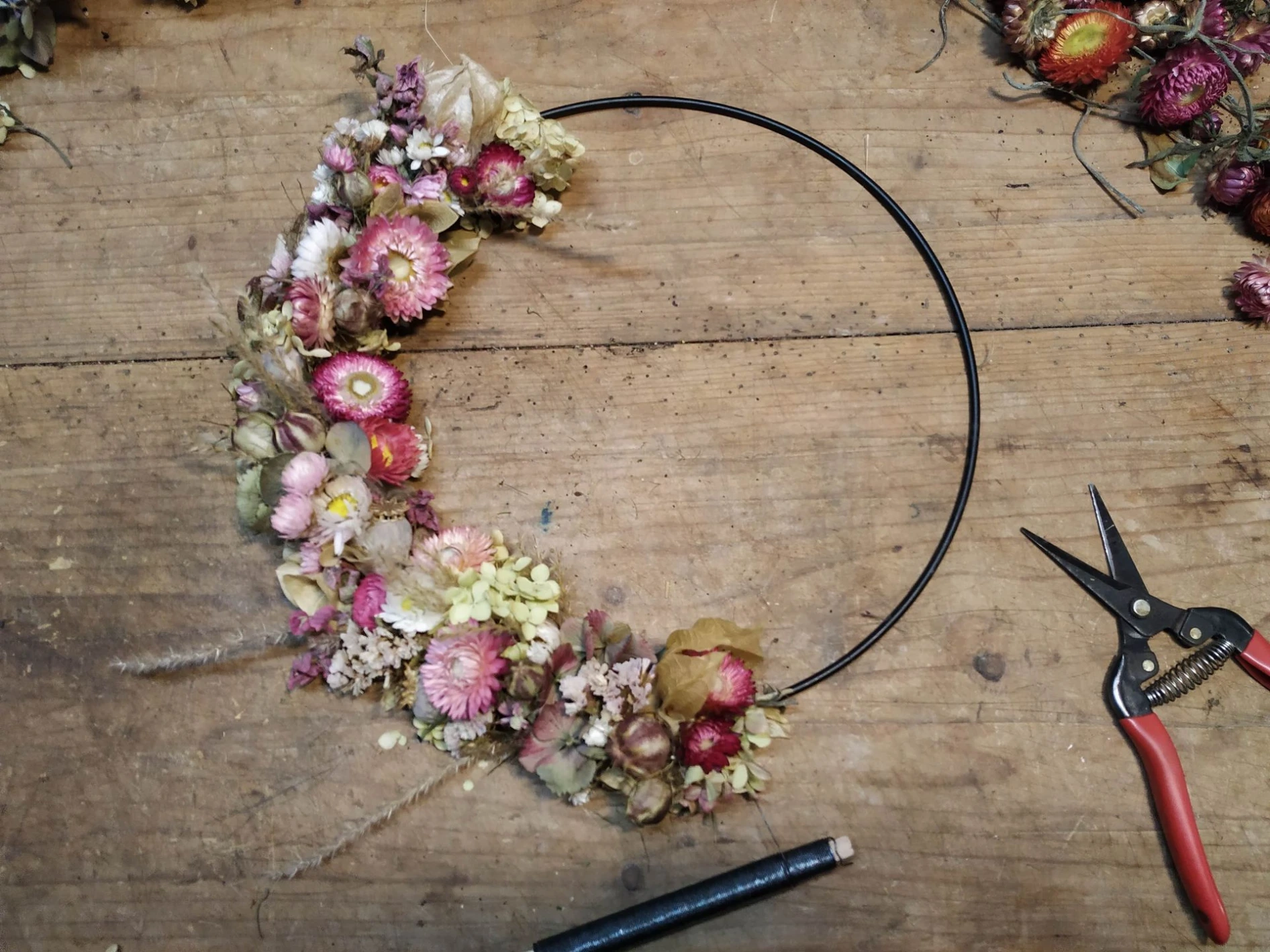 Wir binden einen schönen Reifen zur Hälfte mit Trockenblumen und können dabei aus der Fülle des Bio-Trockenblumenvorrats schöpfen. Gestalte ein langlebiges Werkstück in kräftigen Farben oder in zarten Pastelltönen, ganz nach Lust und Laune.